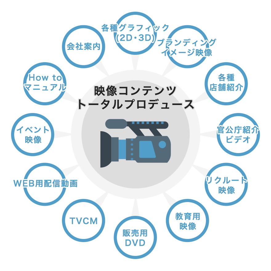 会社案内映像/採用・リクルート映像/店舗紹介/商品イメージ映像/教育・マニュアル動画/イベント用映像/展示会動画/官公庁紹介動画/販売(セル)用DVD制作