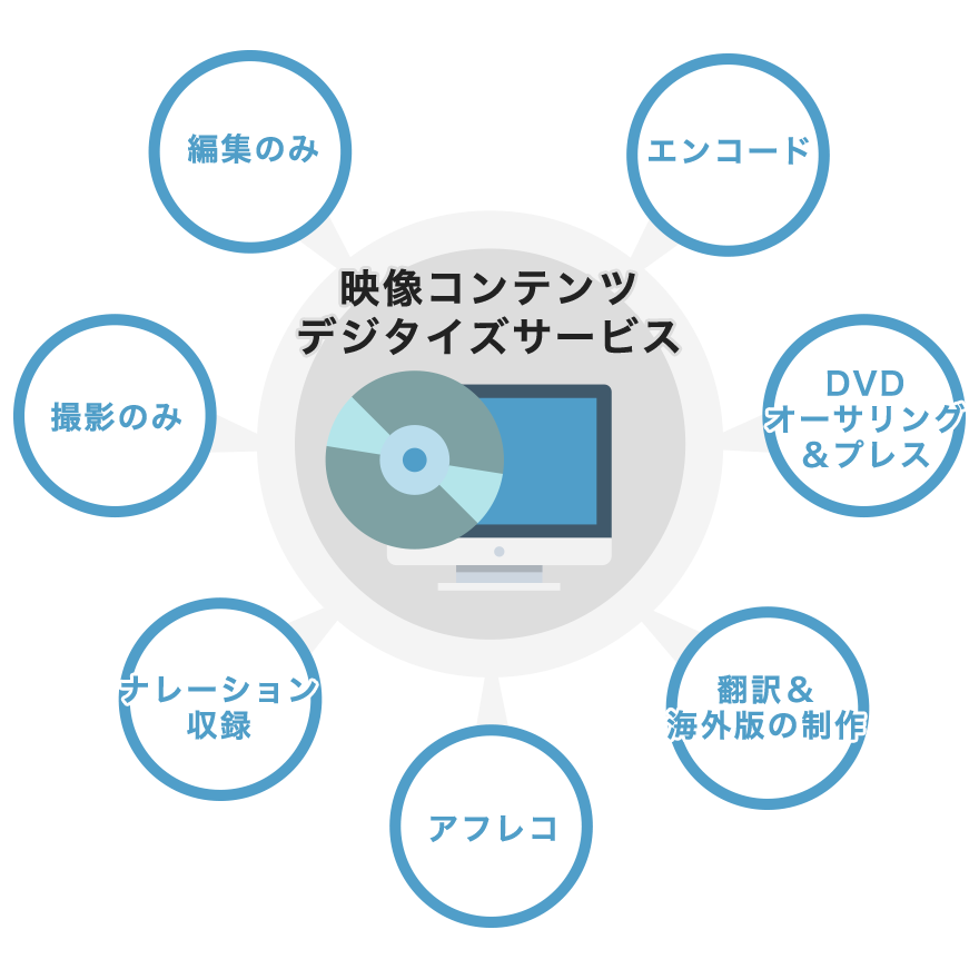 撮影のみ/編集のみ/エンコード/ナレーション収録・アフレコ/翻訳&海外版の制作/DVDオーサリング&プレス